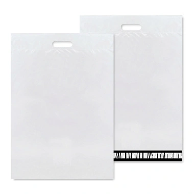 Белые курьерские пакеты 380x440 мм с вырубной ручкой выполнены из непрозрачного трёхслойного полиэтилена высокого давления (ПВД, англ. LDPE или PE-LD), имеют приятный внешний вид, мягкие и прочные, устойчивые к механическим повреждениям и проколам. Из полиэтилена такого качества изготавливают все курьерские и почтовые пакеты.