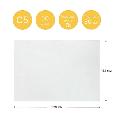 Бумажный конверт формата C5 с размерами 162 мм. х 229 мм. с отрывной силиконовой лентой и клеевым слоем. Такой конверт предназначен для размещения бумаги формата А4, сложенной пополам, или развернутой бумаги формата А5.