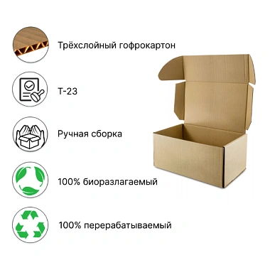 Бурая почтовая коробка типа "Б" – это вторая по размеру после самой большой коробки типа "А". Изготовлена из качественного трехслойного гофрированного картона марки Т-23, который в свою очередь изготовлен из переработанной целлюлозы. Гофрокороба отличаются своей невысокой стоимостью, являются экологически чистым продуктом и обеспечивают надежную защиту содержимого посылки. Вес посылки может составлять 15-18 кг. Размеры коробки указаны внутренние.