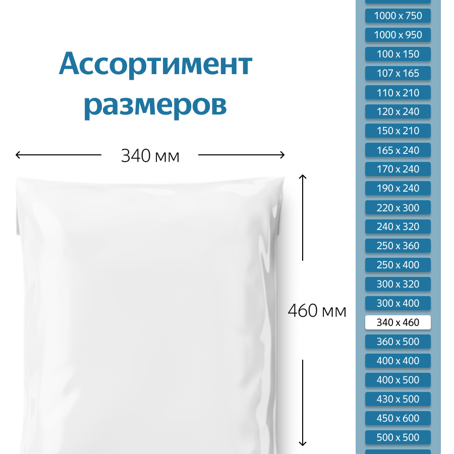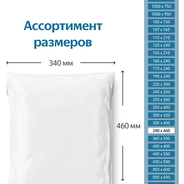 Среднего размера пластиковый пакет 340*460 мм из прочного полиэтилена толщиной 50 мкм идеально подойдет для хранения и транспортировки крупных партий документов и ксерокопий, большого объема корреспонденции, печатной продукции – журналов, газет, открыток, архивной документации, детской и взрослой одежды из трикотажа, хозяйственной продукции, предметов личной гигиены и т.п., без кармана для письма, открытки с адресом или сопроводительной документации.