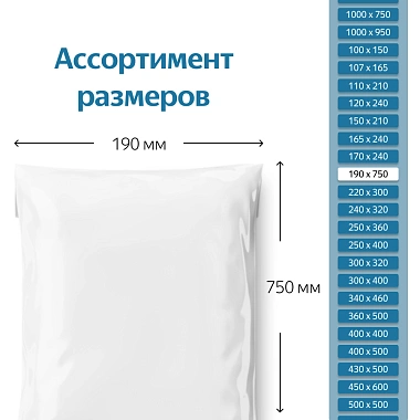 Размер пакета 190*750 мм позволяет вместить очень большой объем предметов промышленного назначения, текстильных и трикотажных изделий, одежды для детей и взрослых, подарочной и сувенирной продукции, предметов радиоэлектроники и хозяйственно-бытового назначения. Большой пластиковый пакет подойдет для хранения и отправки габаритных вещей курьерскими службами или почтой. Данный пакет не имеет карман для сопроводительного письма или открытки с адресом, но любой текст можно написать на поверхности пакета.
