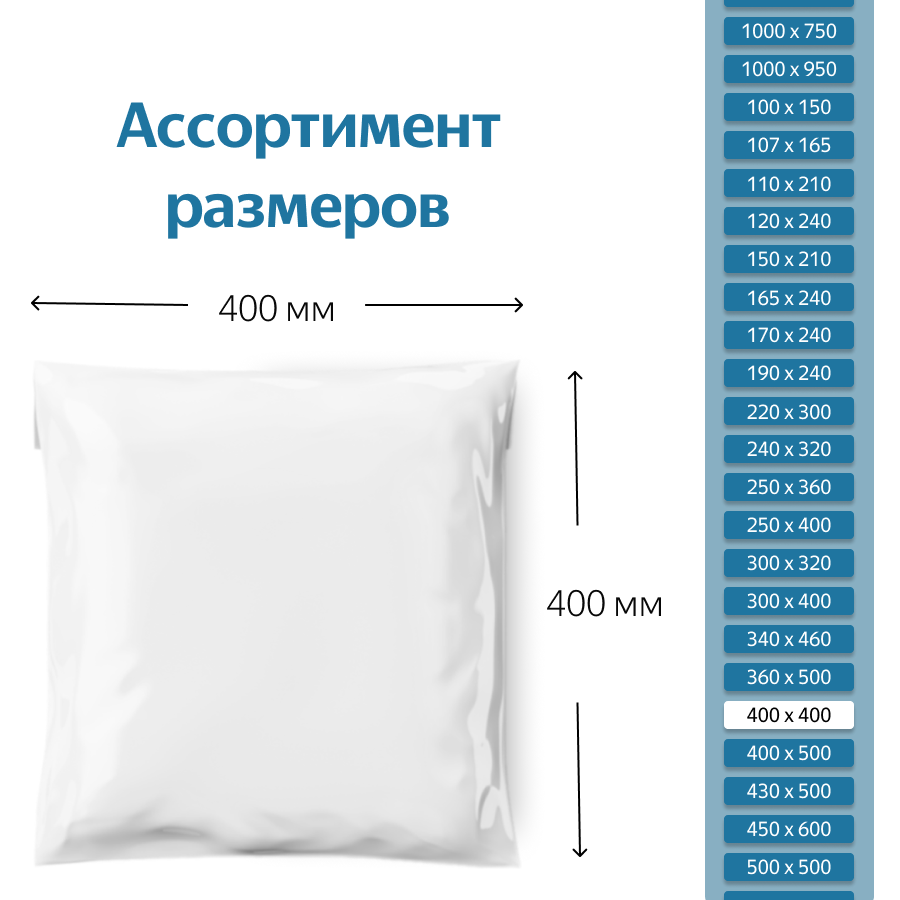 Курьерский пакет размером 400*400 мм при толщине материала 50 мкм без кармана один из самых маленьких выпускаемых белых пластиковых курьер-пакетов подойдет для упаковки и отправки небольших вещей бытового и промышленного назначения, например: