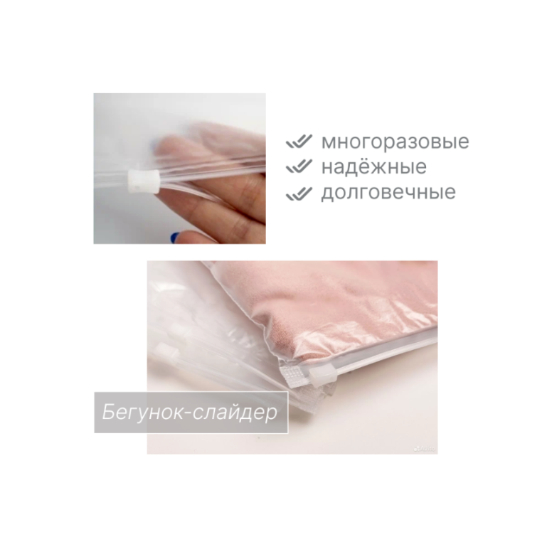 Устойчивы к проколам, разрывам, воздействию влаги, пыли и жиров. Прочные сварные швы не рвутся даже при сильном растяжении упаковки. Благодаря замку-слайдеру зиплоки подходят для многоразового применения – бегунок позволяет многократно открывать и закрывать пакет. Такой замок не выходит из строя даже при длительном применении.