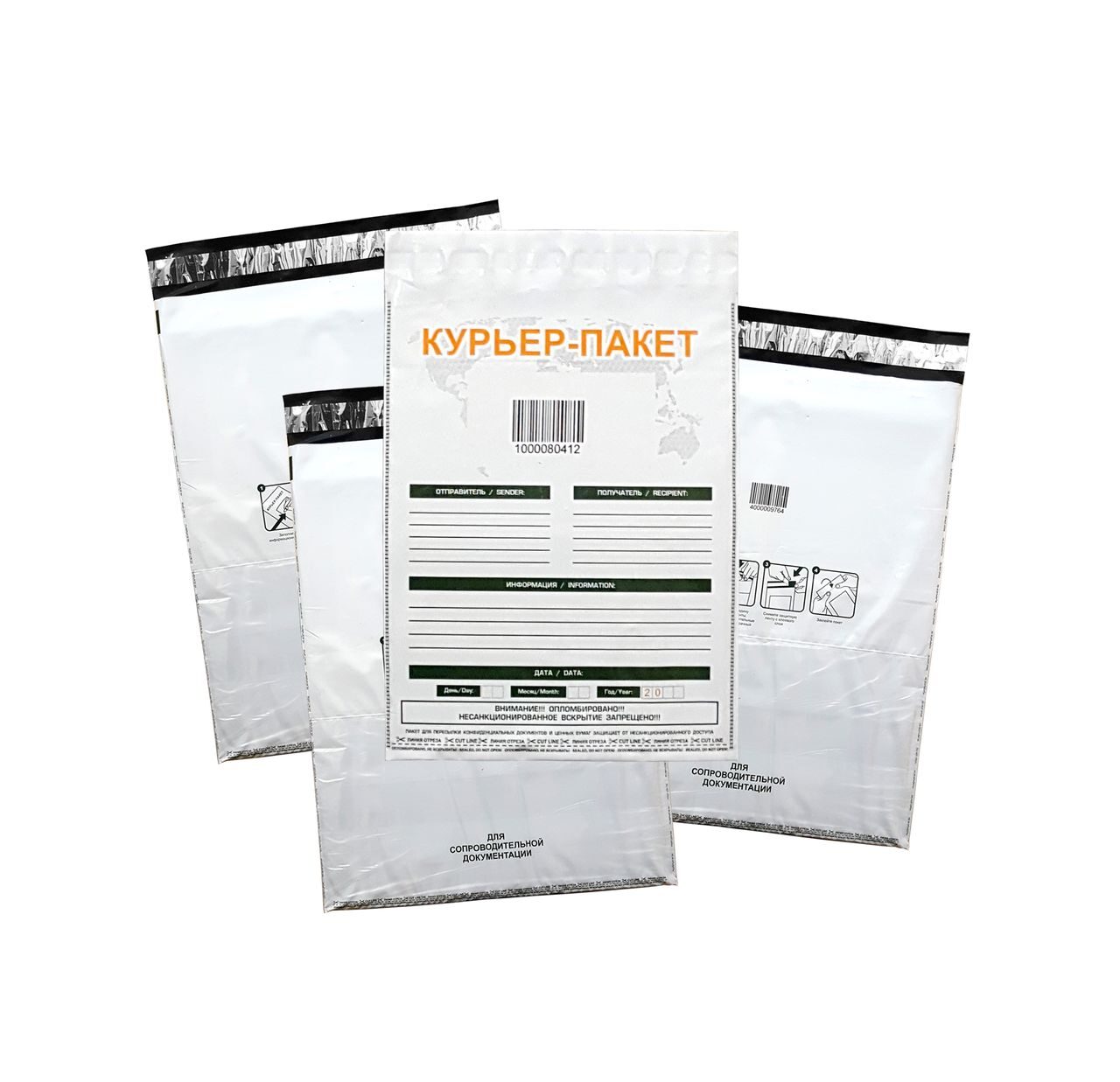 У каждого пакета на лицевой стороне имеется индивидуальный штрих-код, поля для надписей шариковой ручкой, микро-шрифт по периметру пакета, прозрачный карман для сопроводительного письма, открытки с адресом или любой требующейся информации.