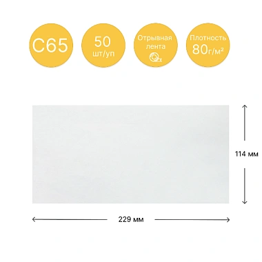 Бумажный конверт формата C65 с размерами 114 мм. х 229 мм. — это довольно распространённый упаковочный предмет, изготовленный из офсетной бумаги белого цвета. Предназначен для хранения документов, писем и отправки их по почте. У конверта есть лицевая сторона, обратная сторона, прямой клапан и отрывная силиконовая лента с клеевым слоем.